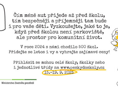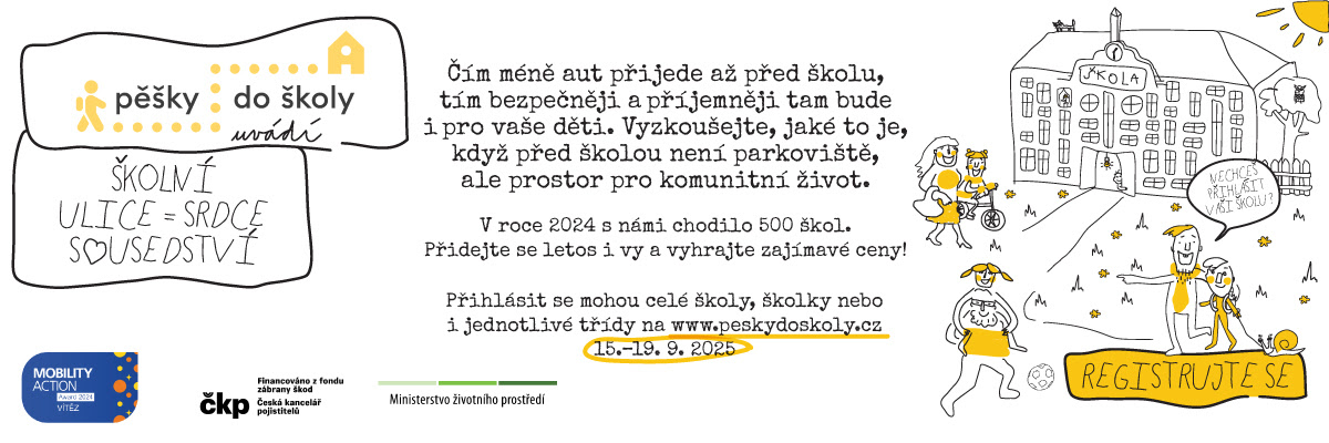 Výzva „Pěšky do školy“ motivuje děti, rodiče i školy, aby se do školy dopravovali aktivně – pěšky, na kole nebo veřejnou dopravou. Z každodenní cesty tak stává příležitost k pohybu, samostatnosti i setkávání a zároveň pomáhá snižovat dopravní zátěž a zlepšovat kvalitu života ve městech.